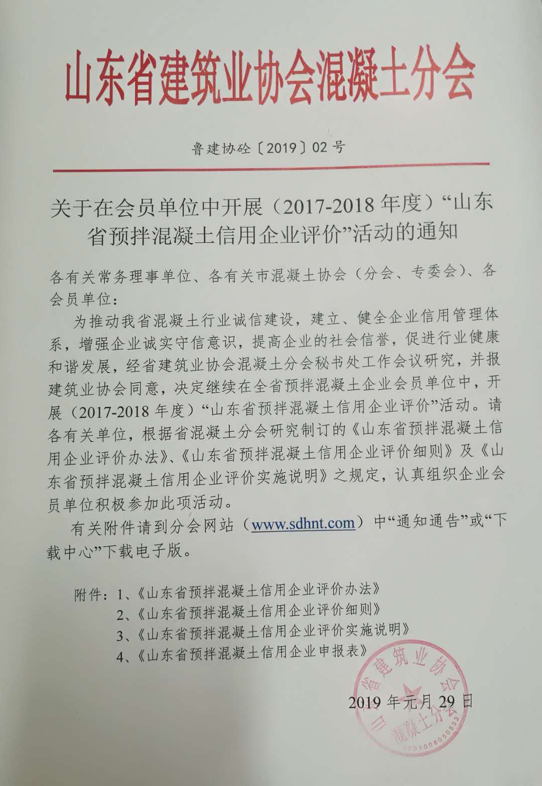 關(guān)于在會(huì)員單位中開展(2017-2018年度)“山東省預(yù)拌混凝土信用企業(yè)評(píng)價(jià)”的通知