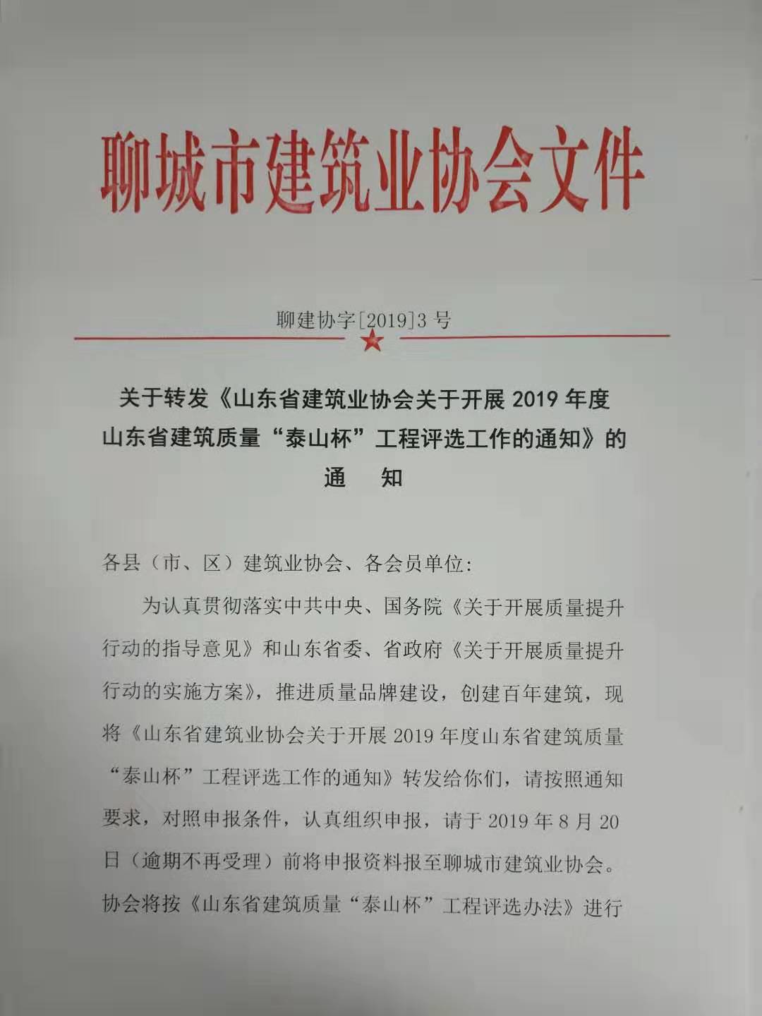 關(guān)于轉(zhuǎn)發(fā)《山東省建筑業(yè)協(xié)會關(guān)于開展2019年度 山東省建筑質(zhì)量 “泰山杯”工程評選工作的通知》的通 知