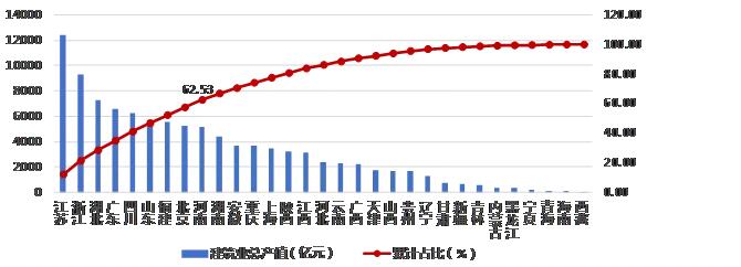 2019 年上半年,江蘇、浙江兩省依然領(lǐng)跑全國各地區(qū)建筑業(yè),建筑業(yè)總產(chǎn)值分別達到 12438.98 億元、9291.17億元,兩省共占全國建筑業(yè)總產(chǎn)值的 21.38%。除江蘇、浙江兩省外,總產(chǎn)值超過 5000 億元的還有湖北、廣東、四川、山東、福建、北京和河南7 個地區(qū),上述 9省市完成的建筑業(yè)總產(chǎn)值占全國建筑業(yè)總產(chǎn)值的 62.53%(圖 1)。