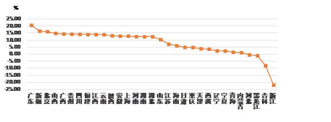 從各地區(qū)建筑業(yè)總產(chǎn)值增長情況看,有 27 個地區(qū)的建筑業(yè)總產(chǎn)值較上年同期有不同幅度的增長。其中,廣東、新疆、北京的增幅均超過 15%。有 4個地區(qū)出現(xiàn)負增長,其中,浙江出現(xiàn)了 超過20% 的負增長(圖 2)。