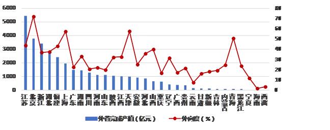 圖4 2019年上半年各地區(qū)跨省完成的建筑業(yè)總產(chǎn)值及外向度