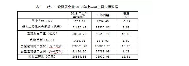 住房和城鄉(xiāng)建設(shè)部匯總的6552個特、一級資質(zhì)建筑業(yè)企業(yè)2019年上半年主要指標數(shù)據(jù)如下(表1)。