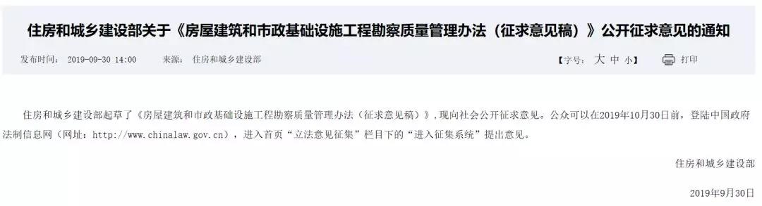 住房和城鄉(xiāng)建設(shè)部起草了《房屋建筑和市政基礎(chǔ)設(shè)施工程勘察質(zhì)量管理辦法(征求意見稿)》,現(xiàn)向社會(huì)公開征求意見。公眾可以在2019年10月30日前,登陸中國政府法制信息網(wǎng)(網(wǎng)址:http://www.chinalaw.gov.cn),進(jìn)入首頁“立法意見征集”欄目下的“進(jìn)入征集系統(tǒng)”提出意見。住房和城鄉(xiāng)建設(shè)部2019年9月30日《房屋建筑和市政基礎(chǔ)設(shè)施工程勘察質(zhì)量管理辦法(征求意見稿)》第一章 總則第一條 為了加強(qiáng)對(duì)房屋建筑和市政基礎(chǔ)設(shè)施工程勘察質(zhì)量的管理,保證工程勘察質(zhì)量,根據(jù)《中華人民共和國建筑法》《建設(shè)工程勘察設(shè)計(jì)管理?xiàng)l例》《建設(shè)工程質(zhì)量管理?xiàng)l例》《建設(shè)工程安全生產(chǎn)管理?xiàng)l例》等有關(guān)法律、法規(guī),制定本辦法。第二條 在中華人民共和國境內(nèi)從事房屋建筑和市政基礎(chǔ)設(shè)施工程(以下簡(jiǎn)稱“工程”)勘察活動(dòng)的,應(yīng)遵守本辦法。本辦法所稱勘察,是指根據(jù)工程要求,查明、分析、評(píng)價(jià)建設(shè)場(chǎng)地的地質(zhì)、環(huán)境特征和巖土工程條件,并提出合理技術(shù)建議,編制工程勘察文件的活動(dòng)。本辦法所稱工程勘察文件,主要包括勘察綱要、勘察報(bào)告等文件。第三條 建設(shè)單位、勘察單位及相關(guān)人員應(yīng)依法對(duì)工程勘察質(zhì)量負(fù)責(zé)。第四條 國務(wù)院住房和城鄉(xiāng)建設(shè)主管部門負(fù)責(zé)全國工程勘察質(zhì)量活動(dòng)的監(jiān)督管理。縣級(jí)以上地方人民政府住房和城鄉(xiāng)建設(shè)主管部門對(duì)本行政區(qū)域內(nèi)的工程勘察質(zhì)量實(shí)施監(jiān)督管理。第五條 工程勘察行業(yè)相關(guān)社會(huì)團(tuán)體應(yīng)完善行業(yè)約束與懲戒機(jī)制,加強(qiáng)行業(yè)自律,維護(hù)公平競(jìng)爭(zhēng),規(guī)范勘察單位和人員依法從事工程勘察活動(dòng)。第六條 鼓勵(lì)采用先進(jìn)技術(shù)、工藝、設(shè)備、材料和管理方法,提高工程勘察質(zhì)量水平。第二章 責(zé)任和義務(wù)第七條 建設(shè)單位應(yīng)依法與勘察單位簽訂勘察合同,明確勘察任務(wù)要求、工期、費(fèi)用以及各自的質(zhì)量責(zé)任義務(wù)。第八條 建設(shè)單位應(yīng)為勘察工作提供必要的現(xiàn)場(chǎng)工作條件。在勘察工作開展前,提供有關(guān)批準(zhǔn)文件,勘察場(chǎng)地地形圖、地下管線及設(shè)施分布圖等與工程勘察有關(guān)的前期資料,并對(duì)資料的真實(shí)性、準(zhǔn)確性、完整性負(fù)責(zé)。第九條 建設(shè)單位應(yīng)加強(qiáng)履約管理,及時(shí)足額支付勘察費(fèi)用。建設(shè)單位可委托具有勘察資質(zhì)的第三方單位提供勘察質(zhì)量管理服務(wù)。建設(shè)單位應(yīng)按規(guī)定將工程勘察文件送施工圖審查機(jī)構(gòu)審查。建設(shè)單位應(yīng)組織勘察單位向設(shè)計(jì)單位、施工單位和監(jiān)理單位進(jìn)行勘察技術(shù)交底。在基坑隱蔽前及時(shí)組織勘察單位、設(shè)計(jì)單位、施工單位、監(jiān)理單位等開展施工驗(yàn)槽。第十條 勘察單位必須依法取得工程勘察資質(zhì)證書,并在資質(zhì)等級(jí)許可的范圍內(nèi)承接勘察業(yè)務(wù)。勘察單位應(yīng)按照有關(guān)法律法規(guī)、工程建設(shè)強(qiáng)制性標(biāo)準(zhǔn)、勘察合同及勘察任務(wù)要求開展勘察工作,編制工程勘察文件,并對(duì)工程勘察文件的真實(shí)性、準(zhǔn)確性和完整性負(fù)責(zé)。工程勘察文件的編制深度應(yīng)符合國家規(guī)定的要求。第十一條 勘察單位應(yīng)按照有關(guān)規(guī)定,建立健全勘察質(zhì)量管理制度并確保有效運(yùn)行。第十二條 勘察單位有權(quán)向建設(shè)單位提出保證工程勘察質(zhì)量所必需的現(xiàn)場(chǎng)工作條件、合理技術(shù)要求和合理工期。第十三條 勘察單位應(yīng)在勘探作業(yè)前向作業(yè)人員進(jìn)行交底。勘察單位應(yīng)嚴(yán)格執(zhí)行勘察綱要和勘察操作規(guī)程,采取措施保證各類管線、設(shè)施和周邊建筑物、構(gòu)筑物的安全,并做好安全記錄。第十四條 勘察單位應(yīng)按照規(guī)范要求對(duì)試驗(yàn)樣品的取樣、密封、送樣、保管、試驗(yàn)進(jìn)行管理。第十五條 勘察單位應(yīng)保證工程勘察工作原始記錄的真實(shí)和準(zhǔn)確,并應(yīng)在勘察過程中及時(shí)整理、核對(duì),嚴(yán)禁離開現(xiàn)場(chǎng)追記或者補(bǔ)記。項(xiàng)目負(fù)責(zé)人或其授權(quán)人員應(yīng)及時(shí)對(duì)原始記錄進(jìn)行驗(yàn)收簽字。鼓勵(lì)勘察單位采用信息化手段,實(shí)時(shí)采集、記錄、存儲(chǔ)工程勘察數(shù)據(jù)。鼓勵(lì)勘察單位采用影像等方式對(duì)鉆探、取樣、原位測(cè)試、室內(nèi)試驗(yàn)等主要過程進(jìn)行記錄。勘察單位在原始記錄中不得存在下列情形:(一)紙質(zhì)原始記錄與電子存儲(chǔ)記錄不一致的;(二)試驗(yàn)、測(cè)試報(bào)告與試驗(yàn)、測(cè)試的過程記錄資料不符的;(三)未按規(guī)定記錄原始數(shù)據(jù)的;(四)各類記錄和報(bào)告的時(shí)間與原始記錄和報(bào)告的時(shí)間不一致的。第十六