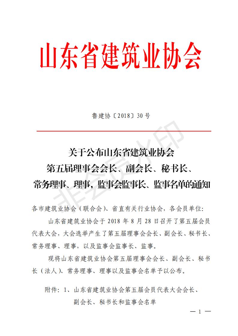 關于公布山東省建筑業(yè)協(xié)會第五屆理事會會長、 副會長、秘書長、常務理事、理事,監(jiān)事會監(jiān)事長、監(jiān)事名單的通知